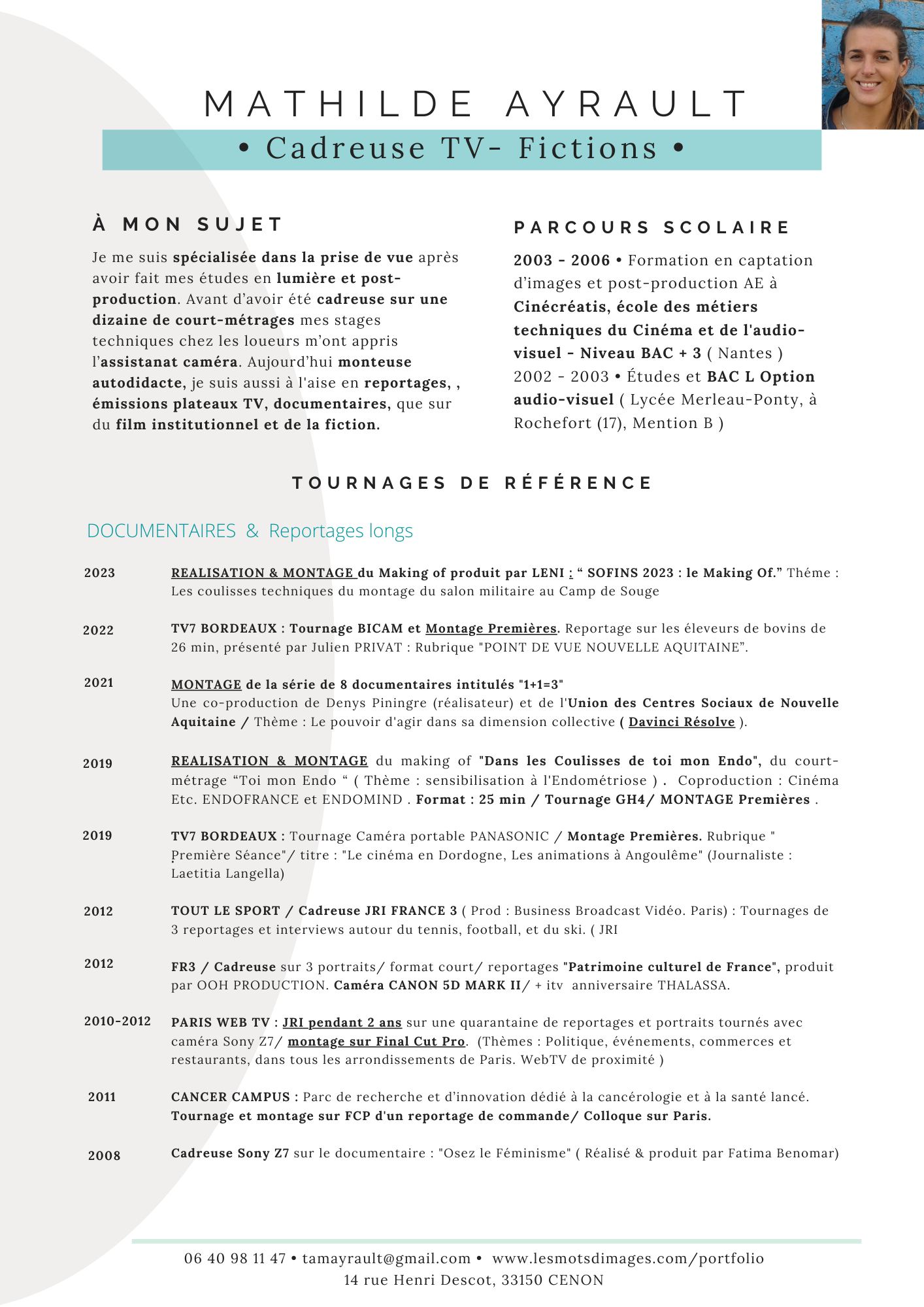 Page 1 : Documentaires et reportages. Page 2 : films institutionnels, émissions web et fictions. OPÉRATRICE IMAGE DANS L'ÉVÉNEMENTIEL